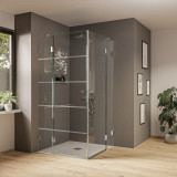 Diese Duschkabine aus 6 mm starkem Einscheibensicherheitsglas (ESG) besteht aus zwei sich nach außen öffnenden Drehtüren mit Festteil. Mit der L-förmigen Form fügt sie sich perfekt in die Ecke Ihres Badezimmers ein. Das auf der Außenseite aufgebrachte Satinierung befindet sich wahlweise auf nur einer oder beiden Türen.